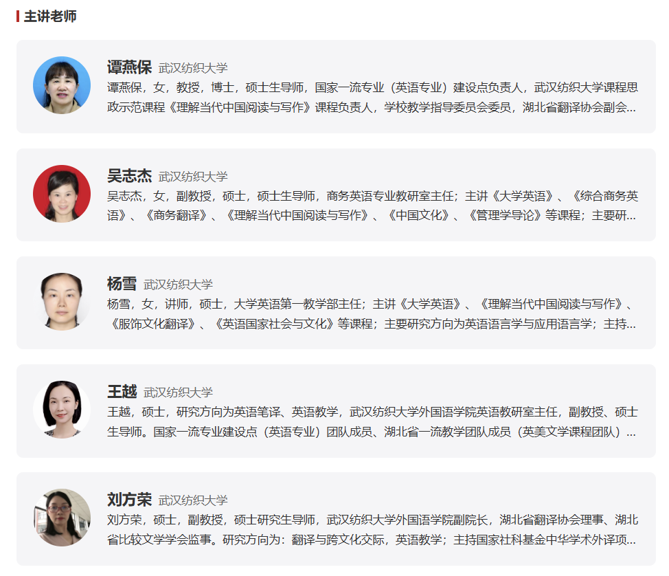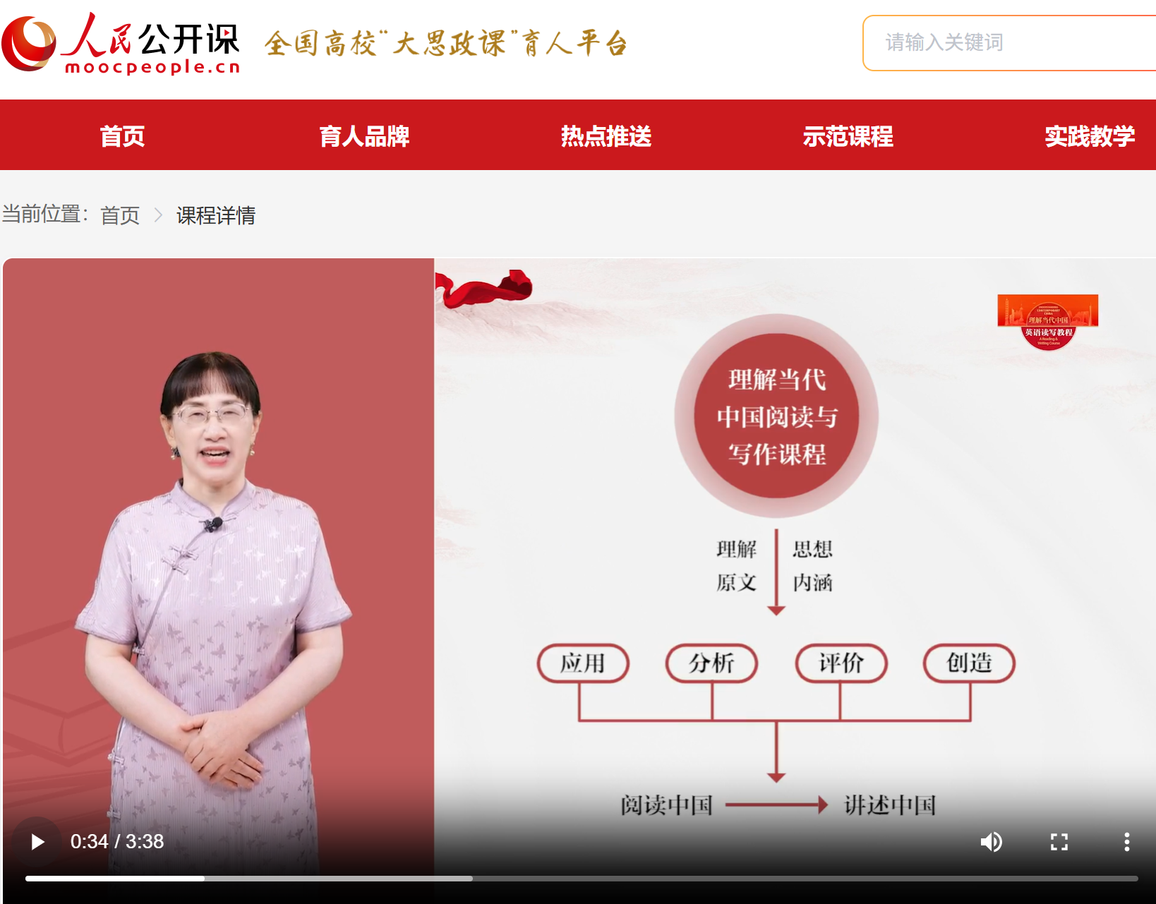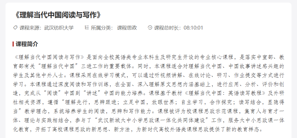 本次上线全课程体系完整、内容详实,涵盖教学视频、课件、术语库、练习题、单元测试等特色教学元素。学习者登录人民网人民公开课平台,即可系统学习这门旨在培养“既精通外语,又通晓国情”的新时代国际化人才的课程思政示范课。