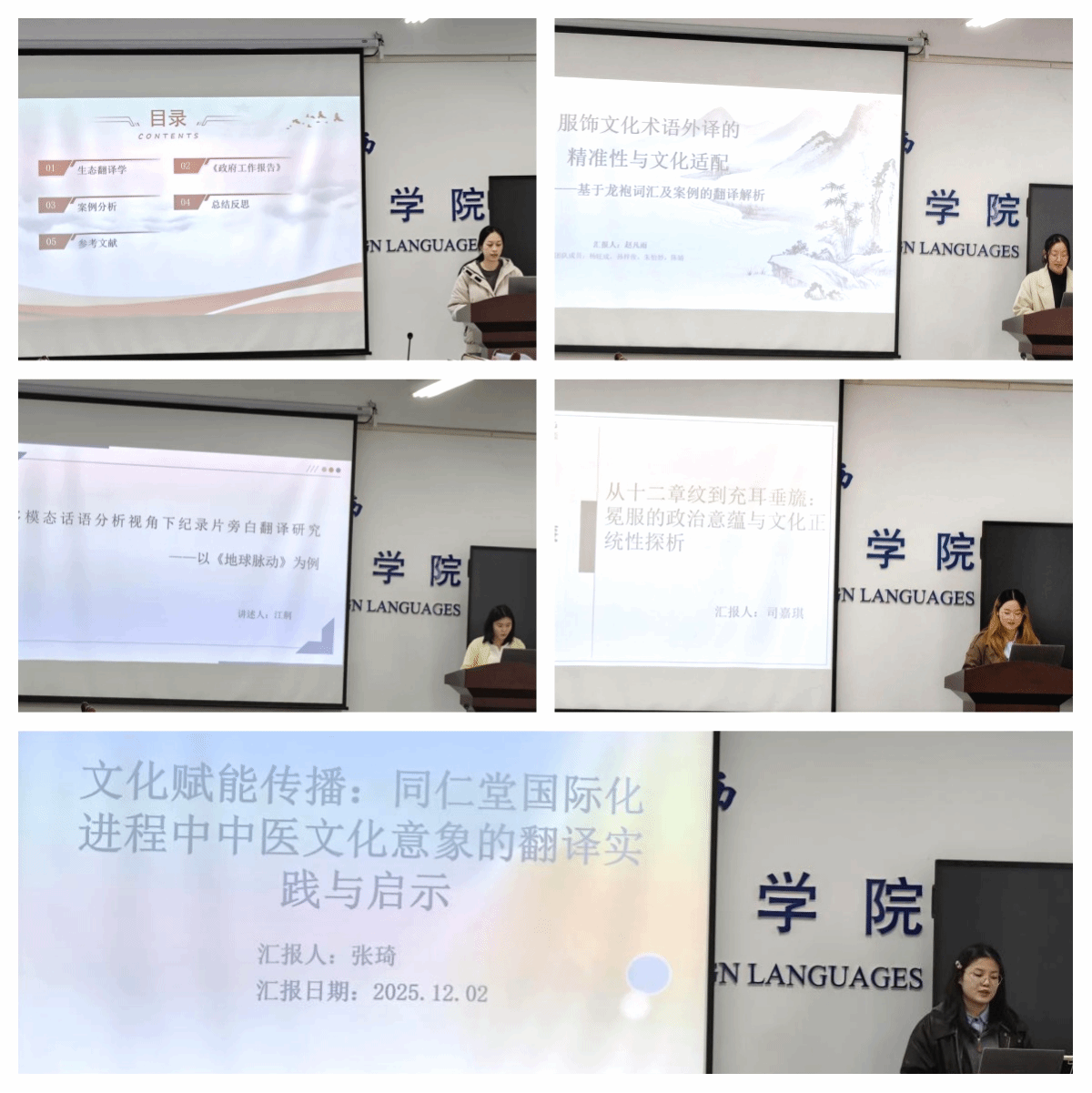 论坛伊始,2024 级 MTI 研究生吴紫睿以《生态翻译学视角下 2025 年〈政府工作报告〉(节选)英译研究》为题,开启了首场分享。她借助生态翻译学理论,选取政府工作报告中的若干案例展开分析,从词汇、句式、文化等多个维度探讨了生态翻译学在政府工作报告英译中的应用策略。她指出,在翻译过程中,不仅要精准传达原文的语义信息,还需充分考量生态翻译学所强调的“适应与选择”原则,使译文在目标语语境中达成最佳适应度,进而更有效地传播中国政府的声音与理念。