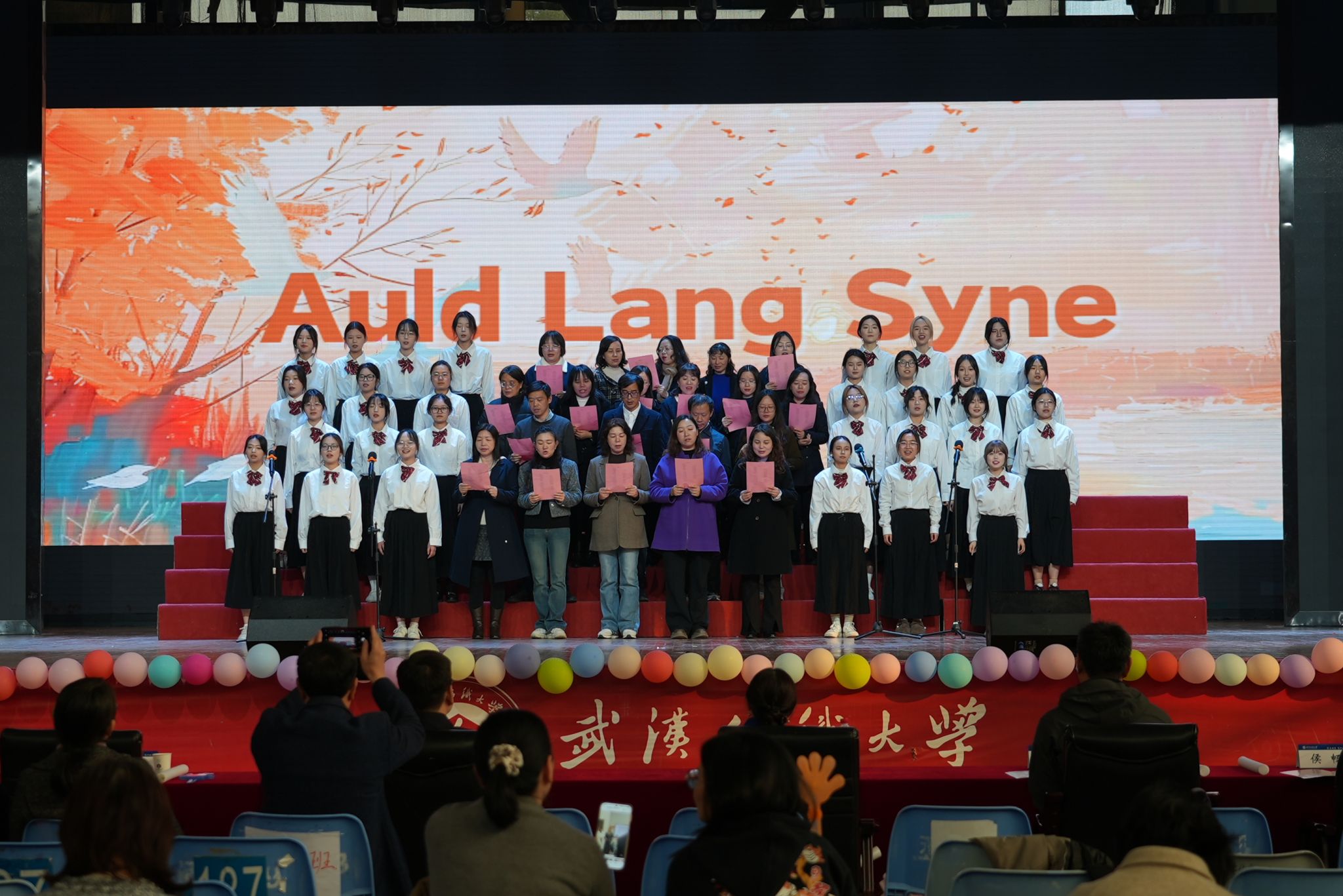闭幕式最后在浓厚的情谊与传承氛围中落下帷幕。大英一部教师的合唱《我和你》旋律悠扬,传递和谐共鸣;全体师生合唱Auld Lang Syne,更以经典旋律引发全场共鸣,为第十九届外语文化节画上了圆满而温暖的句号。