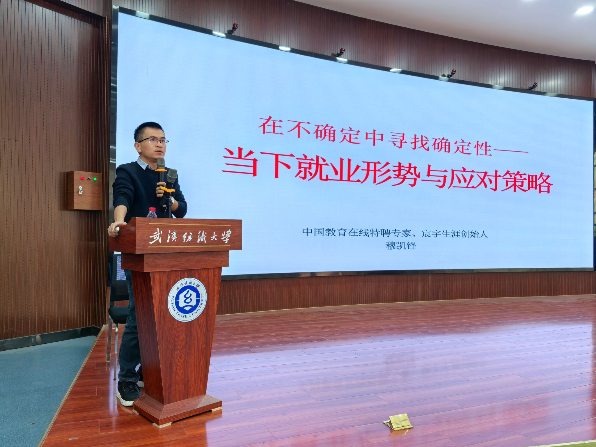 第二位讲师穆凯锋老师,宸宇生涯创始人、中国教育在线特聘专家、湖北省生涯导师团成员,以《在不确定中寻找确定性——当下就业形势与应对策略》为题,为同学们进行了宏观分析与路径指导。他深刻剖析了当前经济形势与毕业生规模持续扩大背景下的就业挑战,引用详实数据阐述了“学历内卷”、“考公考编热”等现象背后的逻辑。穆老师提出了“职业=行业+岗位+企业”的定位公式,引导学生结合自身专业、优势与资源进行科学规划。他强调了早规划、多实践、拿结果的重要性,并针对考公、求职、考研等不同发展路径给出了具体建议,鼓励同学们在不确定性中主动探索,提升核心竞争力,寻找属于自己的幸福职业生涯。