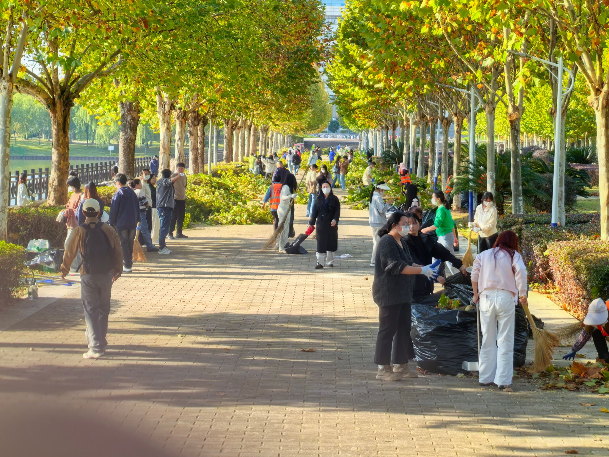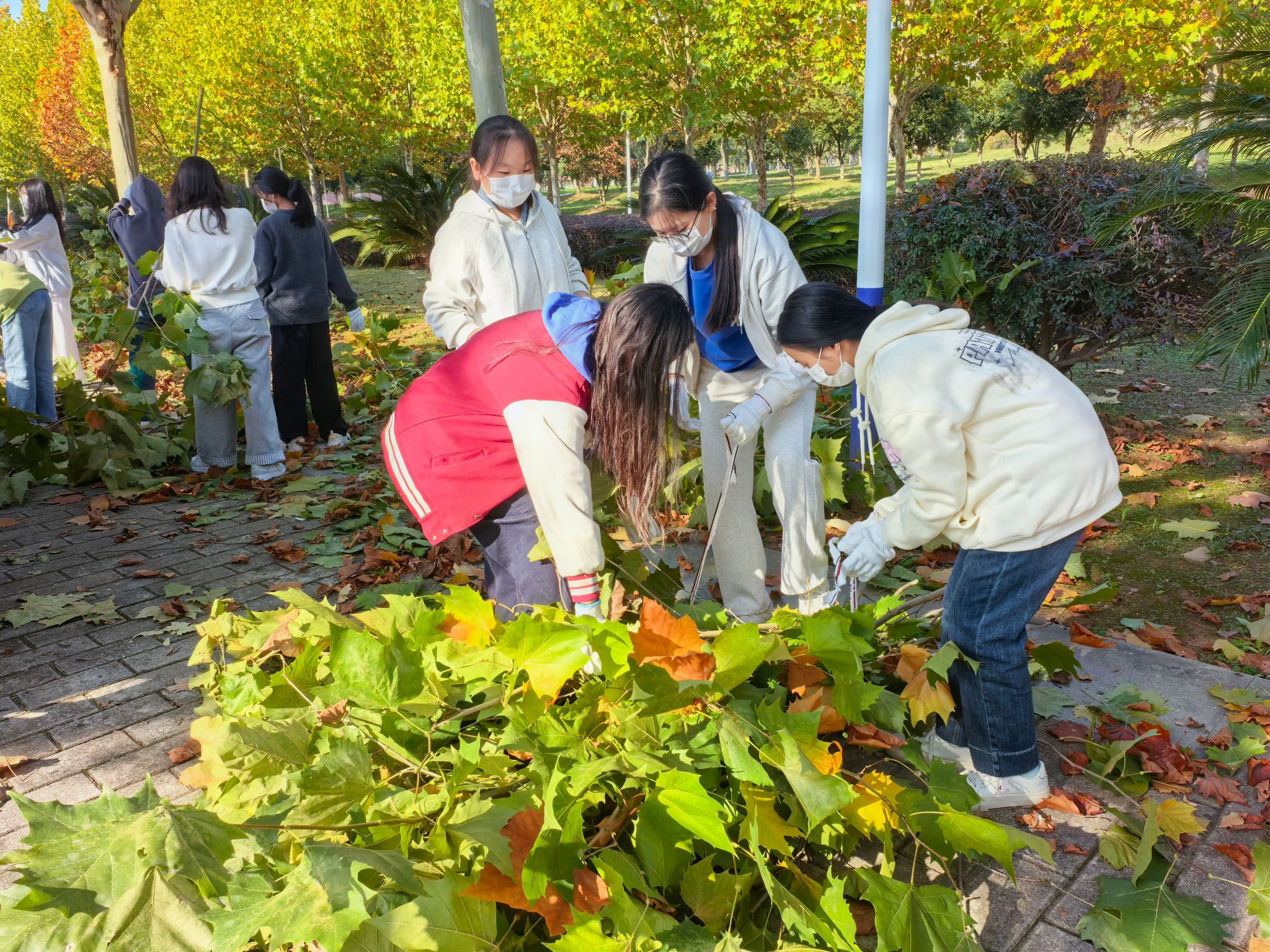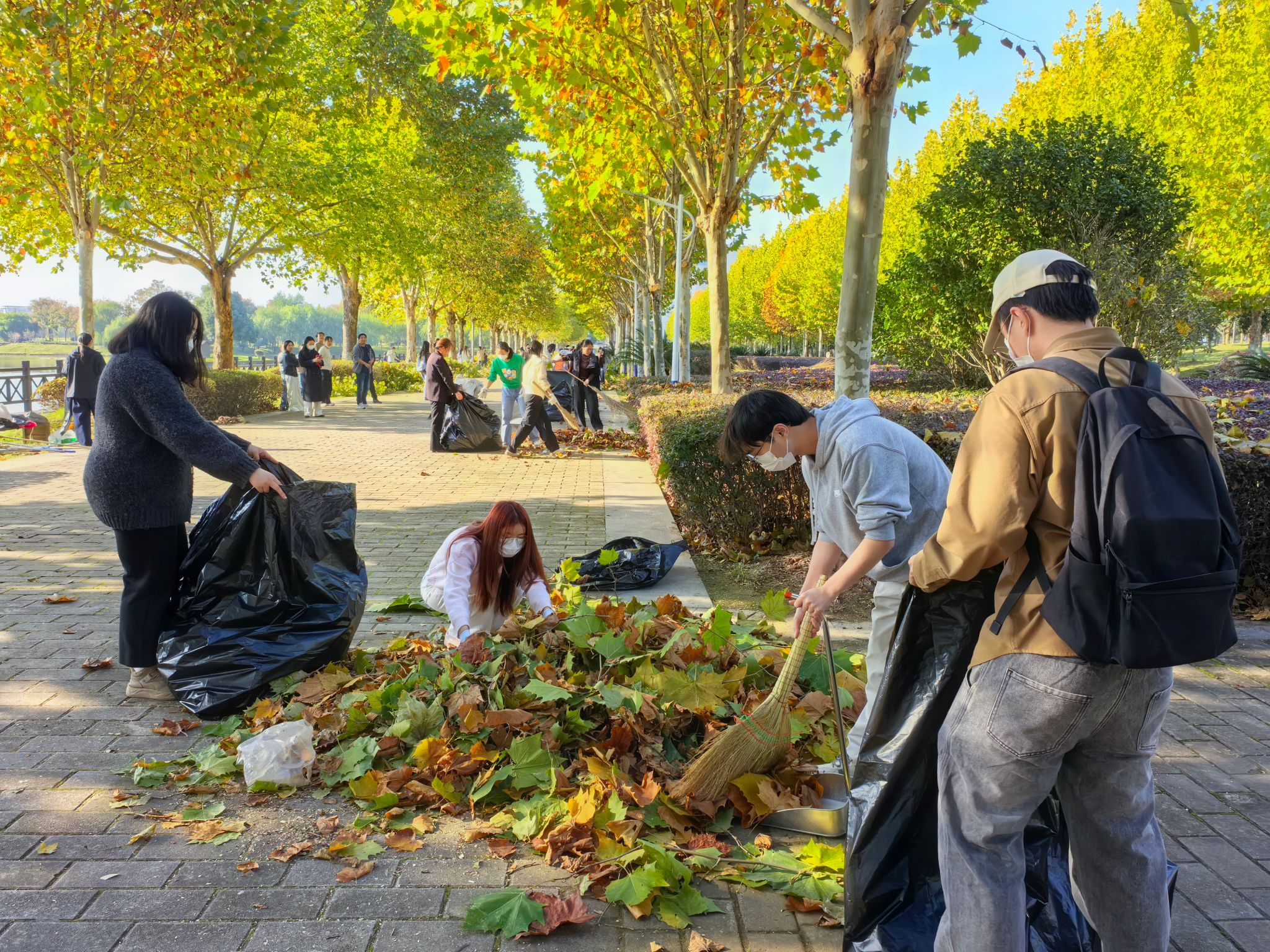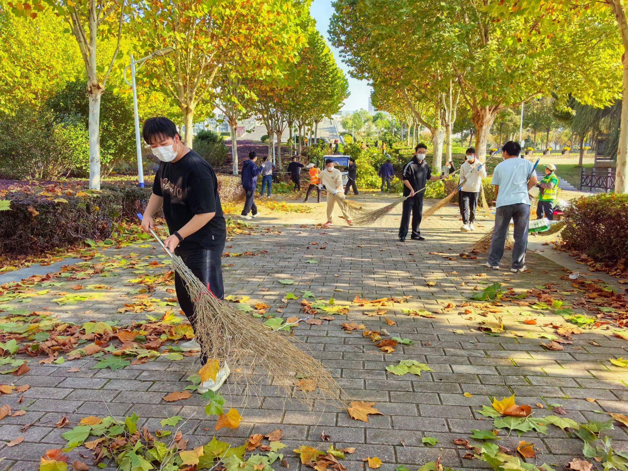 活动开始前,后勤保障处的专业老师对同学们进行了简单的劳动安全与技能指导。随后,在学院领导与老师的带领下,同学们分为若干小组,手持清洁工具,有序奔赴指定区域。深秋的校园落叶纷飞,枯枝堆积,同学们发扬不怕脏、不怕累的精神,细致地清理散落在道路、草坪及绿化带中的落叶与断枝。大家分工协作,配合默契,有的负责清扫归拢,有的负责装袋转运,现场一派热火朝天的劳动景象。经过师生们的共同努力,责任区域内的环境卫生焕然一新,校园秋景更显整洁靓丽。