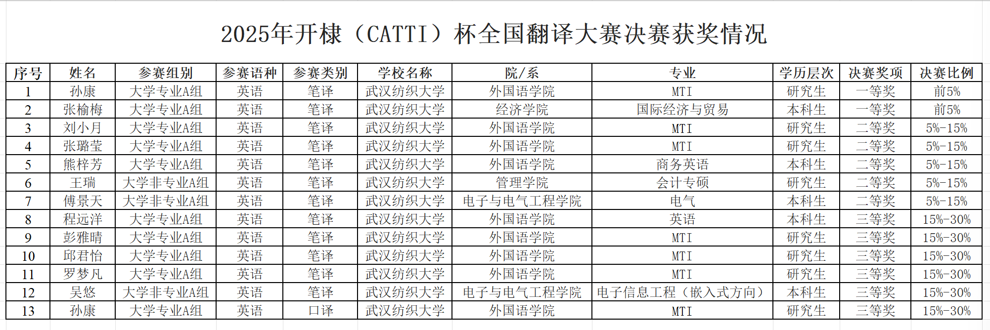 近日,2025年开棣(CATTI)杯全国翻译大赛决赛成绩公布,我校学子在决赛中获得一等奖2项、二等奖5项和三等奖6项的可喜成绩。