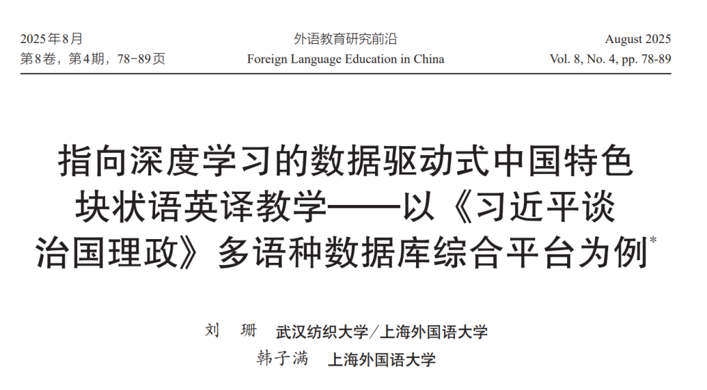 “指向深度学习的数据驱动式中国特色块状语英译教学——以《习近平谈治国理政》多语种数据库综合平台为例”一文探讨了指向深度学习的数据驱动式中国特色块状语英译教学的六个特征并提出教学设计方案,通过案例阐述了《习近平谈治国理政》多语种数据库综合平台在中国特色块状语英译教学中的应用,以期通过深度学习提高大学生语言数据挖掘、数据分析的研究能力以及中国话语传播能力,实现价值塑造、知识传授和能力培养“三位一体”的育人目标。研究发现:指向深度学习的数据驱动式中国特色块状语英译教学可有效帮助学生形成块状语整体提取观,强化对块状语的注意,增强搭配运用能力和语义韵意识,培养学生的家国情怀;同时,帮助学生提高语言数据挖掘、数据分析等方面的研究能力,从而实现以学习者为中心的发现式和探索式深度学习。