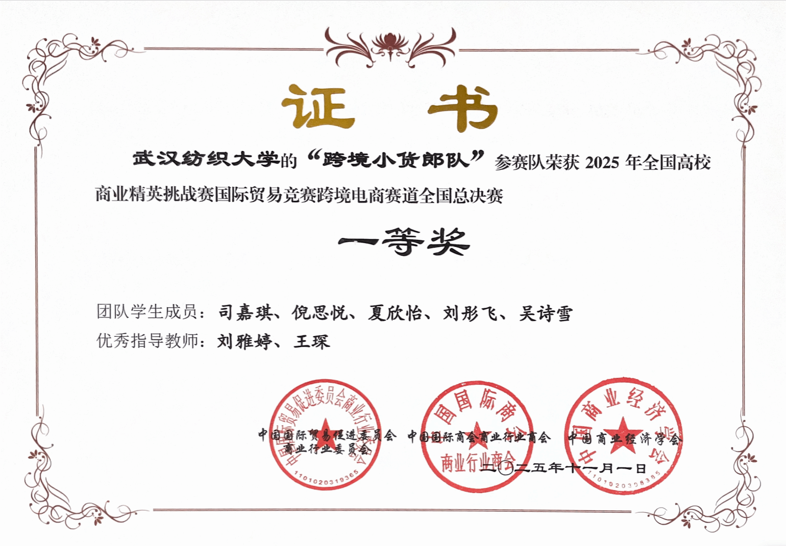 近日,全国高校商业精英挑战赛国际贸易竞赛跨境电商赛道全国总决赛圆满落幕。本届赛事吸引了来自全国28个省、自治区、直辖市的近500所高校、超5000支队伍同台竞技。经过激烈角逐,必赢76net线路商务英语专业司嘉琪同学领衔的“跨境小货郎”团队(商英司嘉琪,税收倪思悦,电信夏欣怡,英语刘彤飞,数媒吴诗雪)在刘雅婷和王琛老师的指导下斩获全国总决赛一等奖。